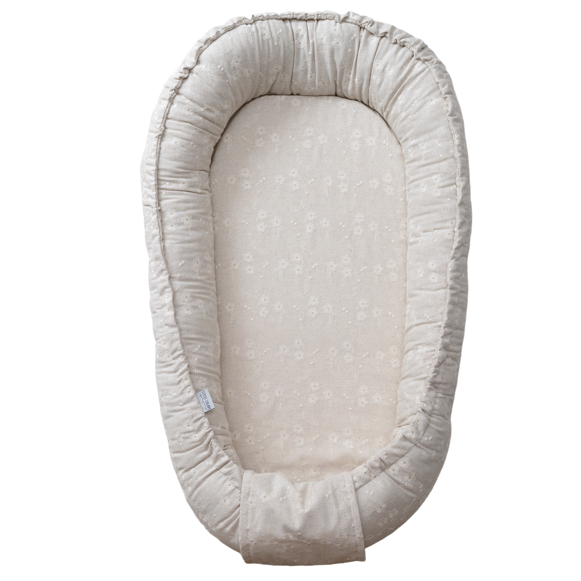 This baby nest is crafted from a stunning embroidered linen fabric and lovingly handmade just for you. It’s an incredibly practical essential — the soft padded edges keep your little one safe while providing a warm and secure feeling.